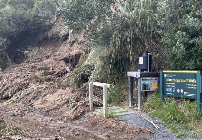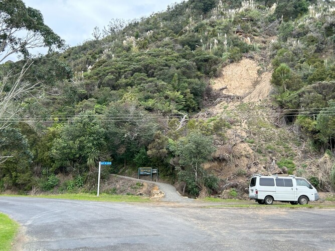 As can be seen from the above photo, Cyclone Gabrielle in February caused a major slip which obliterated the Matarangi entrance to the track. The Department of Conservation engaged a contractor to repair the Matarangi entrance and we are pleased to announce that this entrance has now been re-opened: