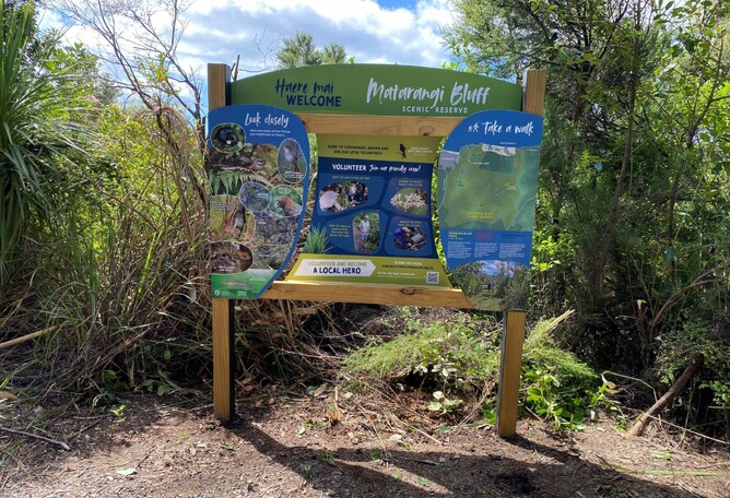 The first of what will be 3 information signs has now been installed at the top of the ridge that is not far from the Matarangi entrance to the reserve.
