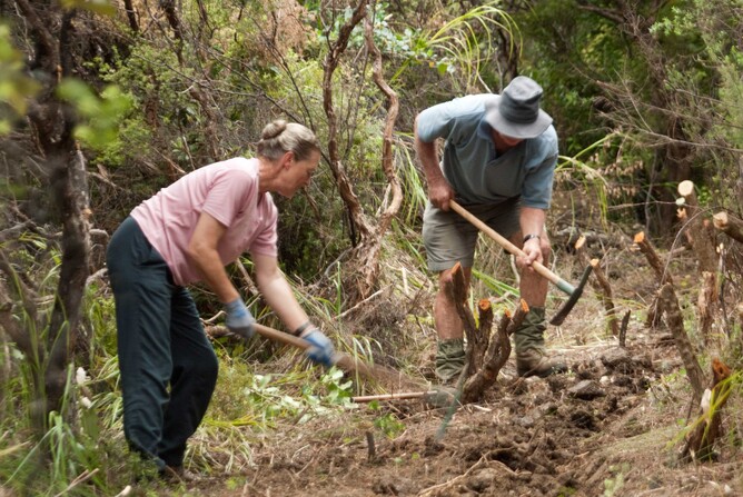 The Rings Beach Wetland Group is tremendously proud of its achievements since Bruce Smith first came up with the idea of creating a walking track in the Matarangi Bluff Scenic Reserve, and roped in Ian McDonald and Sarah Cooper to help him (see Ian and Sarah at work above).