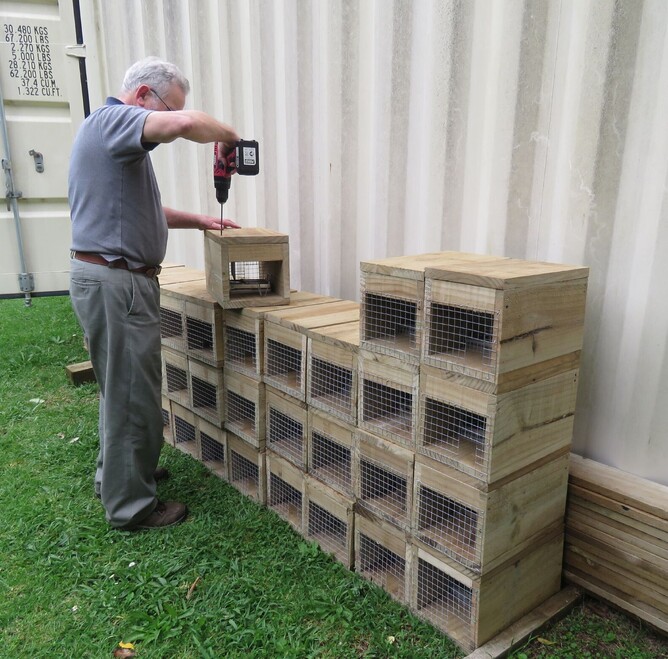 In order to make the most of our money, one of our volunteers, John Scott (above), built the rat trap cages and the stoat trap (DOC200) boxes.