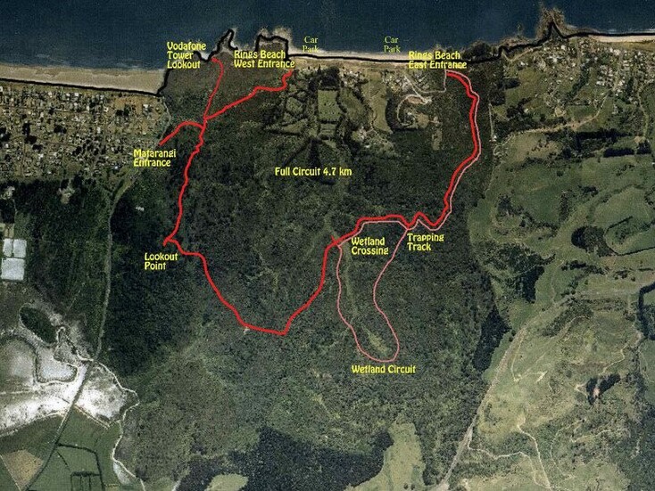 One entrance is in Matarangi, and the other two are close to the the east and west carparks at the Rings Beach end of Bluff Road.
