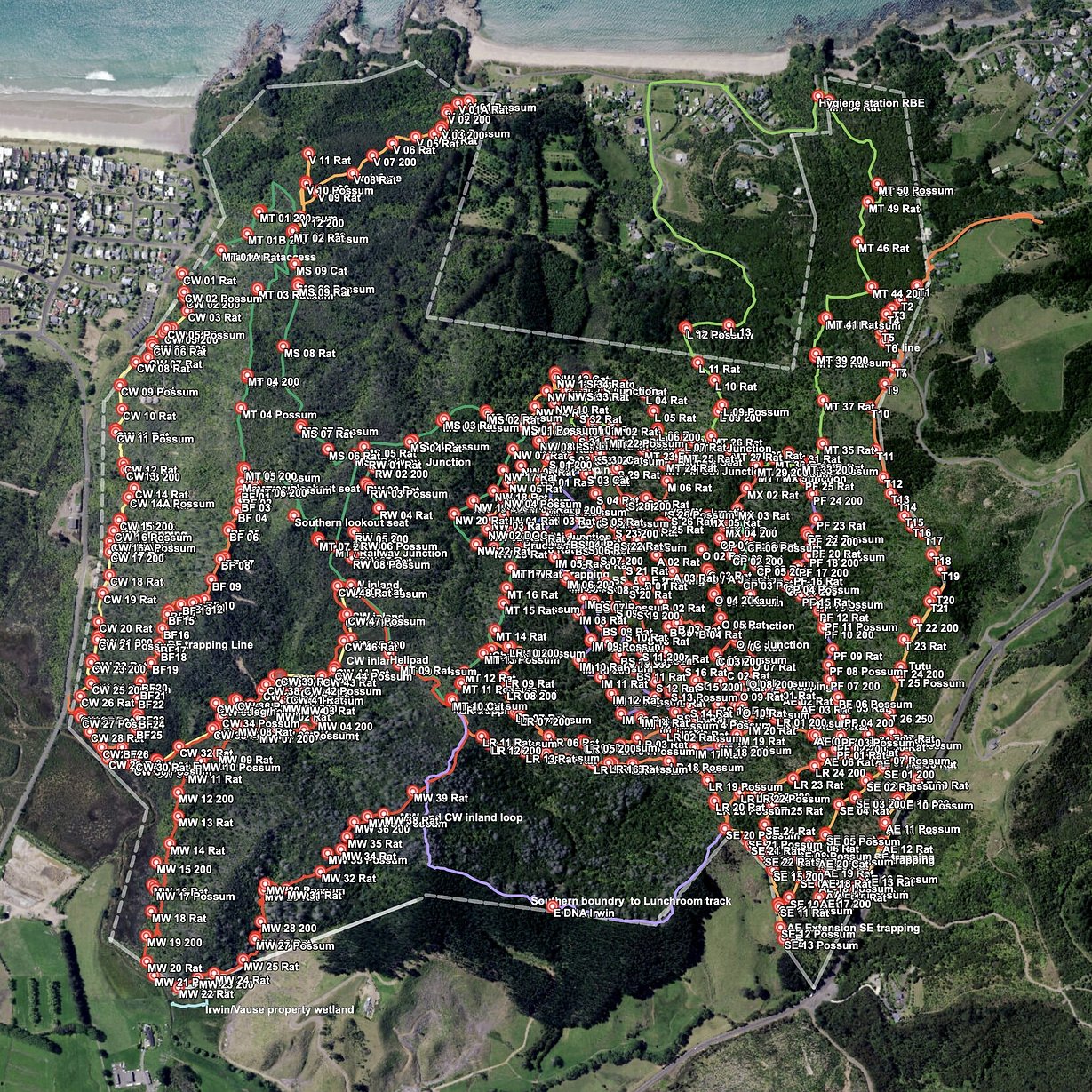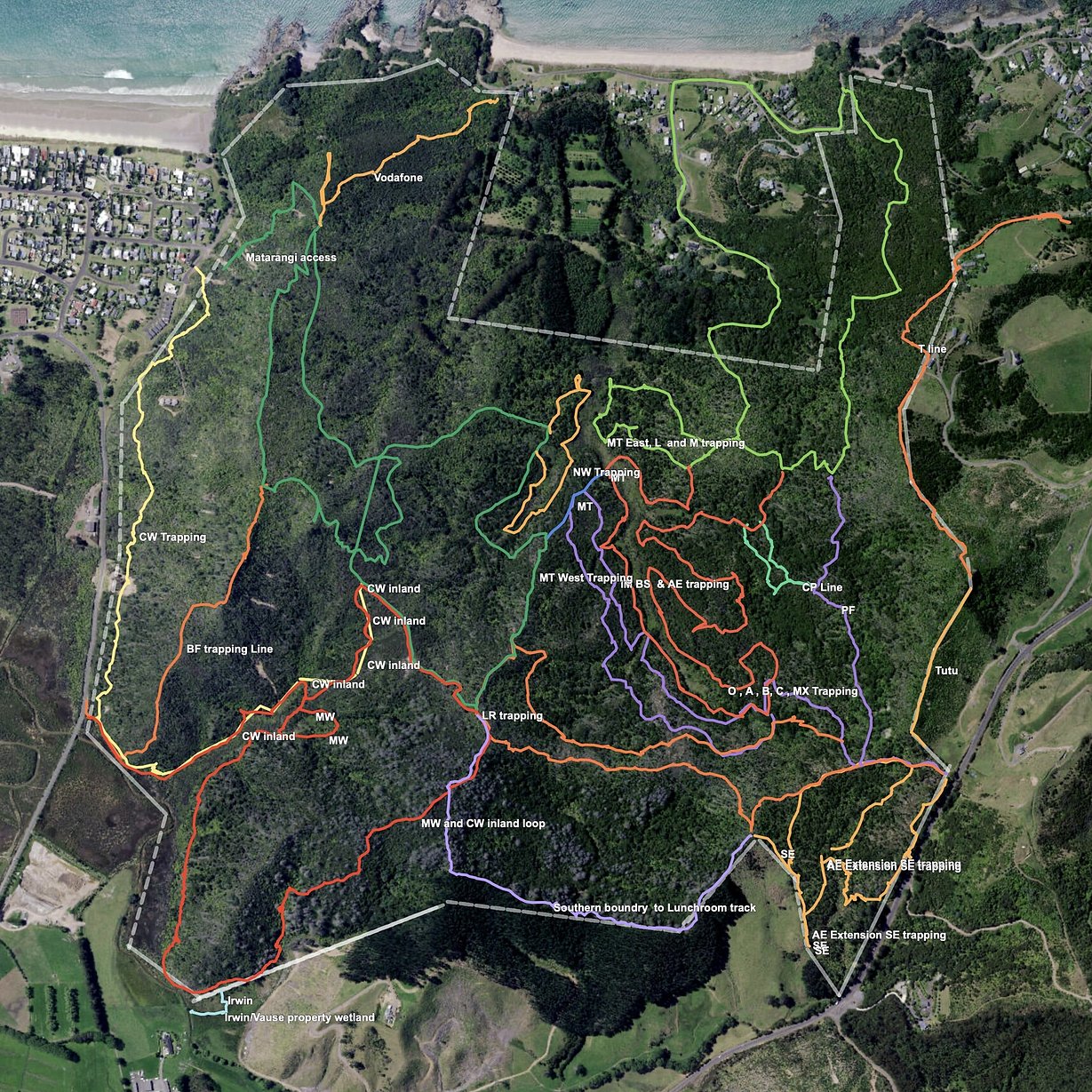 Since 2008 we have established a network of traplines throughout the reserve as shown on the map below. These traplines are checked and cleared weekly by a roster of volunteers.